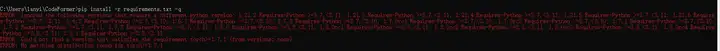 我一开始下载的python是最新版,出现了下面的错误。换了版本后重新执行pip install -r requirements.txt -q,没有出现爆红错误。