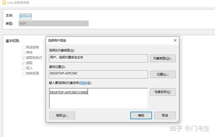 这时权限目录应该变空了。选择添加,点击选择主体,输入用户名。用户名可以从C:\Users目录下查看,然后选择检查名称: