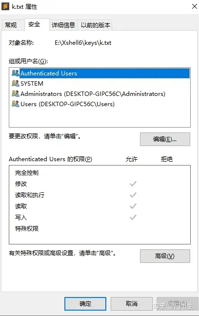 之后接连按确定按钮直至属性窗口退出。至此,就完成了权限的修改。之后就可以使用这个文件去远程登录了。