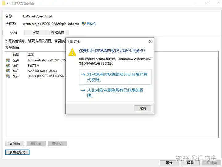 可以看到,许多主体拥有这个文件的权限,如SYSTEM、Administrators。我们要把这些主题从权限目录中删掉。点击高级按钮,进去点禁用继承,选择从此对象中删除所有已继承的权限。