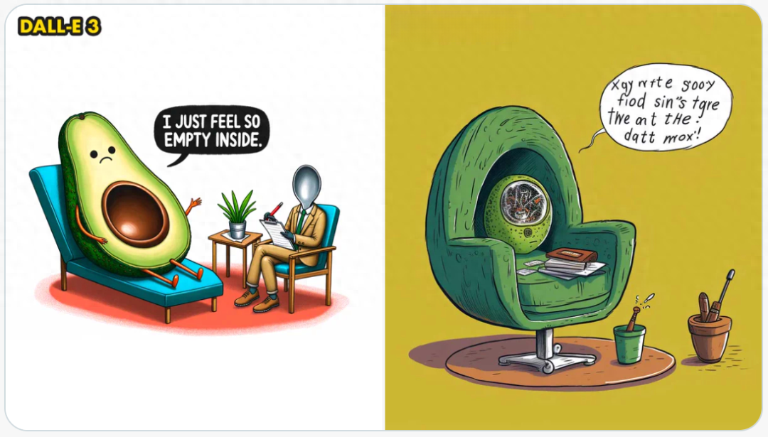 prompt 为「一个鳄梨坐在治疗师的椅子上,说『我只是觉得内心很空虚』,中间有一个坑大小的洞。治疗师、一个勺子、潦草地写笔记。」