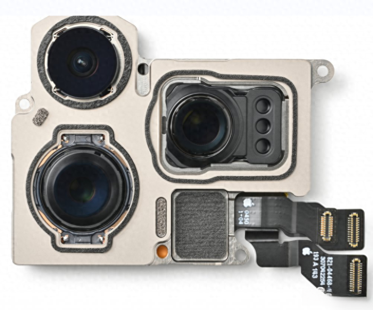 除了新的潜望镜镜头外,iPhone 15 Pro Max主摄像头和宽摄像头上的传感器似乎与去年的14 Pro Max尺寸相同,这表明图像质量的任何提高可能更多地与新的A17 Pro处理器有关,而不是与传感器硬件本身。另外,固定相机的的螺丝也比过去大得多。