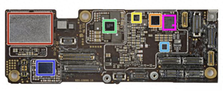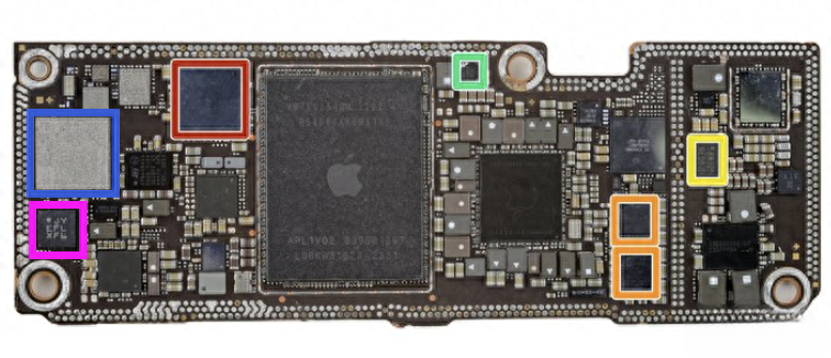 △红色:苹果APL1V02/339S01257 A17 Pro处理器堆叠在SK海力士H58G66AK6HX132 8 GB LPDDR5 SDRAM内存下方。