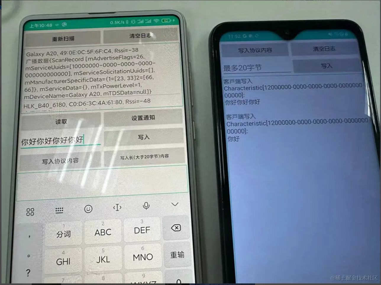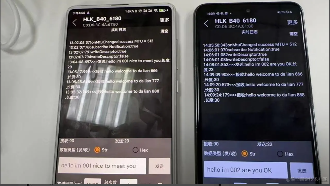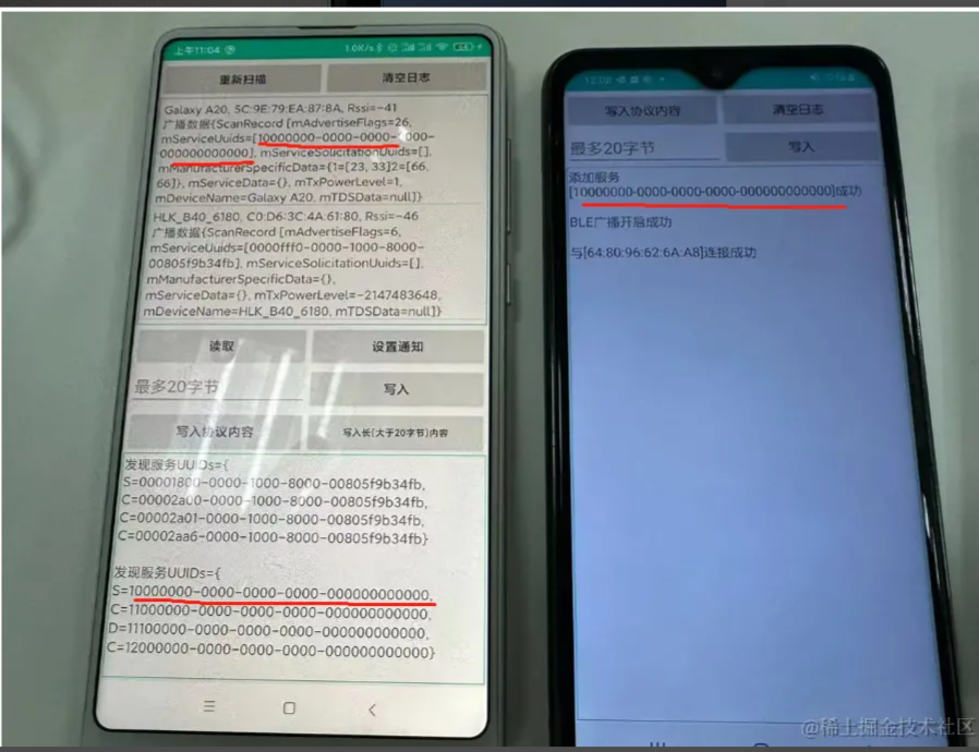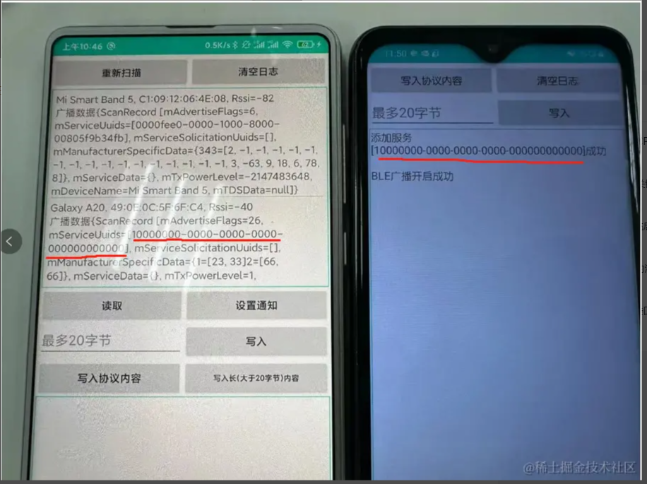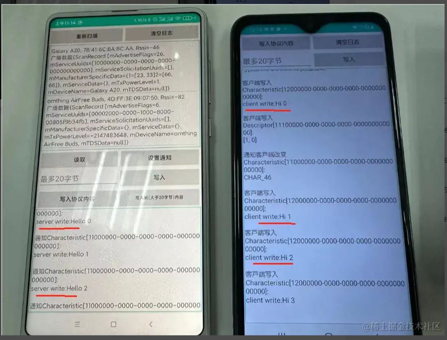 五:蓝牙操作的注意事项 1、如何避免ble蓝牙连接出现133错误? Android 连接外围设备的数量有限,当不需要连接蓝牙设备的时候,必须调用 BluetoothGatt#close 方法释放资源; 蓝牙 API 连接蓝牙设备的超时时间大概在 20s 左右,具体时间看系统实现。有时候某些设备进行蓝牙连接的时间会很长,大概十多秒。如果自己手动设置了连接超时时间在某些设备上可能会导致接下来几次的连接尝试都会在 BluetoothGattCallback#onConnectionStateChange 返回 state == 133; 能否避免android设备与ble设备连接/断开时上报的133这类错误? 1、在连接失败或者断开连接之后,调用 close 并刷新缓存 2、尽量不要在startLeScan的时候尝试连接,先stopLeScan后再去连 3、对同一设备断开后再次连接(连接失败重连),哪怕调用完close,需要等待一段时间(400毫秒试了1次,结果不 行;1000毫秒则再没出现过问题)后再去connectGatt 4、可以在连接前都startLeScan一下,成功率要高一点 2、单次写的数据大小有20字节限制,如何发送长数据? BLE单次写的数据量大小是有限制的,通常是20字节,可以尝试通过requestMTU增大,但不保证能成功。分包写是一种解决方案,需要定义分包协议,假设每个包大小20字节,分两种包,数据包和非数据包。对于数据包,头两个字节表示包的序号,剩下的都填充数据。对于非数据包,主要是发送一些控制信息。 总体流程如下: (1)、定义通讯协议,如下(这里只是个举例,可以根据项目需求扩展) 消息号(1个字节)功能(1个字节)子功能(1个字节)数据长度(2个字节)数据内容(N个字节)CRC校验(1个字节)0101010000–2D 消息号(1个字节) 功能(1个字节) 子功能(1个字节) 数据长度(2个字节) 数据内容(N个字节) CRC校验(1个字节) 01 01 01 0000 – 2D (2)、封装通用发送数据接口(拆包) 该接口根据会发送数据内容按最大字节数拆分(一般20字节)放入队列,拆分完后,依次从队列里取出发送 (3)、封装通用接收数据接口(组包) 该接口根据从接收的数据按协议里的定义解析数据长度判读是否完整包,不是的话把每条消息累加起来 (4)、解析完整的数据包,进行业务逻辑处理 (5)、协议还可以引入加密解密,需要注意的选算法参数的时候,加密后的长度最好跟原数据长度一致,这样不会影响拆包组包 3、在Android不同版本或不同的手机扫描不到蓝牙设备 一般都是Android版本适配以及不同ROM机型(小米/红米、华为/荣耀等)(EMUI、MIUI、ColorOS等)的权限问题 4、读写问题 蓝牙的写入操作, 读取操作必须序列化进行. 写入数据和读取数据是不能同时进行的, 如果调用了写入数据的方法, 马上调用又调用写入数据或者读取数据的方法,第二次调用的方法会立即返回 false, 代表当前无法进行操作; 5、一个完整的数据包分析 AAAB5D65501E08040004001B130053D550F6 AA – 前导帧(preamble) 0x50655DAB – 访问地址(access address) 1E – LL帧头字段(LL header) 08 – 有效数据包长度(payload length) 04000400 – ATT数据长度,以及L2CAP通道编号 1B – notify command 0x0013 – 电量数据handle 0x53 – 真正要发送的电量数据 0xF650D5 – CRC24值 参考文档: 蓝牙技术联盟: www.bluetooth.com/zh-cn/learn… BLE技术详解: doc.iotxx.com/BLE%E6%8A%8… Android蓝牙BLE开发指南: developer.android.com/guide/topic… BLE蓝牙开源库: github.com/Jasonchenli… github.com/dingjikerbo… github.com/aicareles/A… github.com/NordicSemic… github.com/xiaoyaoyou1…