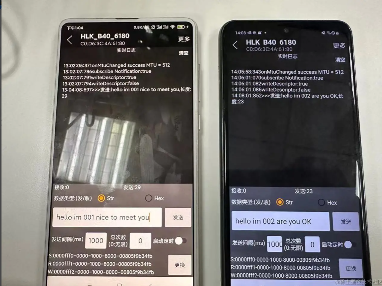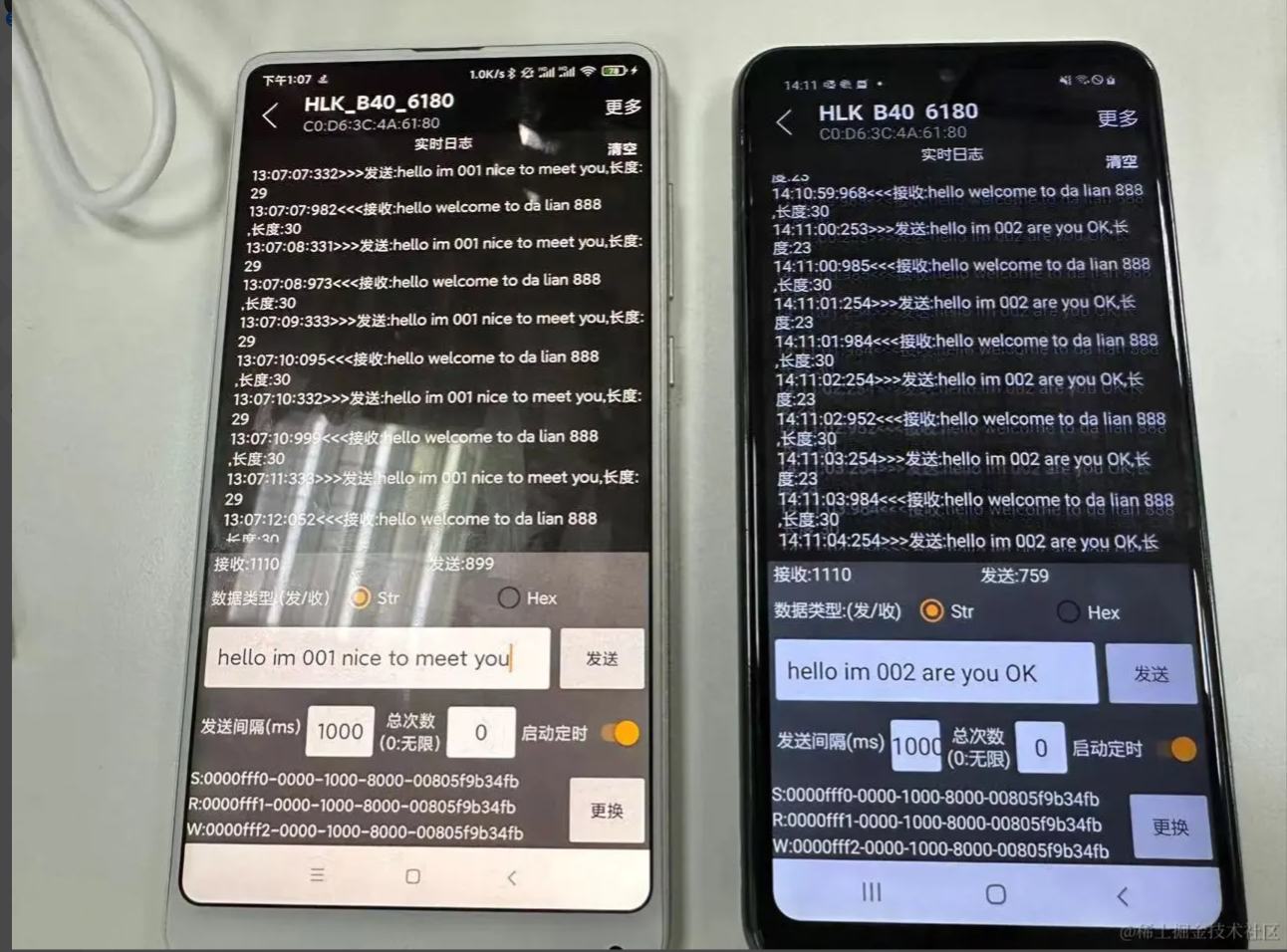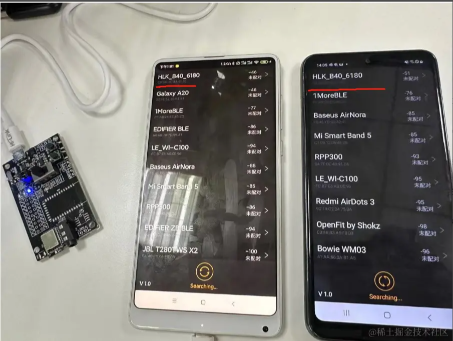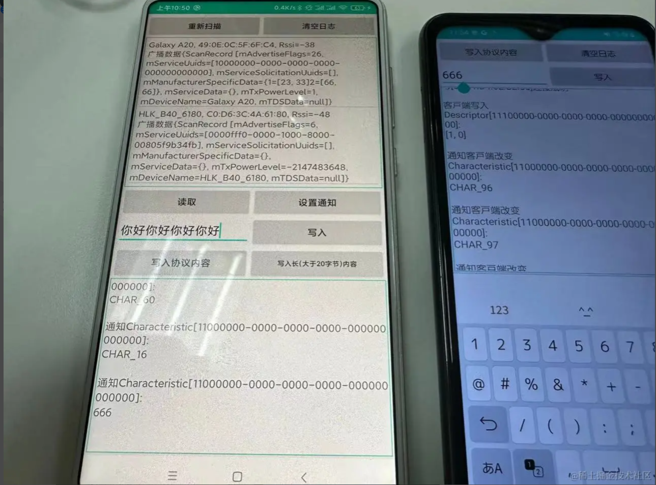 五:蓝牙操作的注意事项 1、如何避免ble蓝牙连接出现133错误? Android 连接外围设备的数量有限,当不需要连接蓝牙设备的时候,必须调用 BluetoothGatt#close 方法释放资源; 蓝牙 API 连接蓝牙设备的超时时间大概在 20s 左右,具体时间看系统实现。有时候某些设备进行蓝牙连接的时间会很长,大概十多秒。如果自己手动设置了连接超时时间在某些设备上可能会导致接下来几次的连接尝试都会在 BluetoothGattCallback#onConnectionStateChange 返回 state == 133; 能否避免android设备与ble设备连接/断开时上报的133这类错误? 1、在连接失败或者断开连接之后,调用 close 并刷新缓存 2、尽量不要在startLeScan的时候尝试连接,先stopLeScan后再去连 3、对同一设备断开后再次连接(连接失败重连),哪怕调用完close,需要等待一段时间(400毫秒试了1次,结果不 行;1000毫秒则再没出现过问题)后再去connectGatt 4、可以在连接前都startLeScan一下,成功率要高一点 2、单次写的数据大小有20字节限制,如何发送长数据? BLE单次写的数据量大小是有限制的,通常是20字节,可以尝试通过requestMTU增大,但不保证能成功。分包写是一种解决方案,需要定义分包协议,假设每个包大小20字节,分两种包,数据包和非数据包。对于数据包,头两个字节表示包的序号,剩下的都填充数据。对于非数据包,主要是发送一些控制信息。 总体流程如下: (1)、定义通讯协议,如下(这里只是个举例,可以根据项目需求扩展) 消息号(1个字节)功能(1个字节)子功能(1个字节)数据长度(2个字节)数据内容(N个字节)CRC校验(1个字节)0101010000–2D 消息号(1个字节) 功能(1个字节) 子功能(1个字节) 数据长度(2个字节) 数据内容(N个字节) CRC校验(1个字节) 01 01 01 0000 – 2D (2)、封装通用发送数据接口(拆包) 该接口根据会发送数据内容按最大字节数拆分(一般20字节)放入队列,拆分完后,依次从队列里取出发送 (3)、封装通用接收数据接口(组包) 该接口根据从接收的数据按协议里的定义解析数据长度判读是否完整包,不是的话把每条消息累加起来 (4)、解析完整的数据包,进行业务逻辑处理 (5)、协议还可以引入加密解密,需要注意的选算法参数的时候,加密后的长度最好跟原数据长度一致,这样不会影响拆包组包 3、在Android不同版本或不同的手机扫描不到蓝牙设备 一般都是Android版本适配以及不同ROM机型(小米/红米、华为/荣耀等)(EMUI、MIUI、ColorOS等)的权限问题 4、读写问题 蓝牙的写入操作, 读取操作必须序列化进行. 写入数据和读取数据是不能同时进行的, 如果调用了写入数据的方法, 马上调用又调用写入数据或者读取数据的方法,第二次调用的方法会立即返回 false, 代表当前无法进行操作; 5、一个完整的数据包分析 AAAB5D65501E08040004001B130053D550F6 AA – 前导帧(preamble) 0x50655DAB – 访问地址(access address) 1E – LL帧头字段(LL header) 08 – 有效数据包长度(payload length) 04000400 – ATT数据长度,以及L2CAP通道编号 1B – notify command 0x0013 – 电量数据handle 0x53 – 真正要发送的电量数据 0xF650D5 – CRC24值 参考文档: 蓝牙技术联盟: www.bluetooth.com/zh-cn/learn… BLE技术详解: doc.iotxx.com/BLE%E6%8A%8… Android蓝牙BLE开发指南: developer.android.com/guide/topic… BLE蓝牙开源库: github.com/Jasonchenli… github.com/dingjikerbo… github.com/aicareles/A… github.com/NordicSemic… github.com/xiaoyaoyou1…