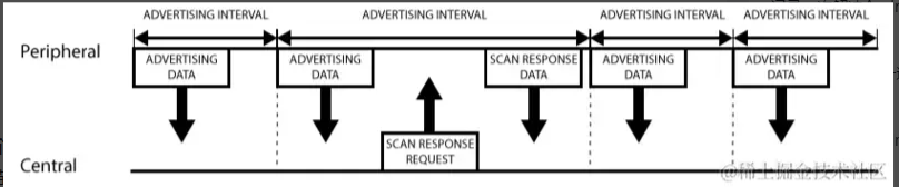 外围设备会设定一个广播间隔,每个广播间隔中,它会重新发送自己的广播数据。广播间隔越长,越省电,同时也不太容易扫描到。