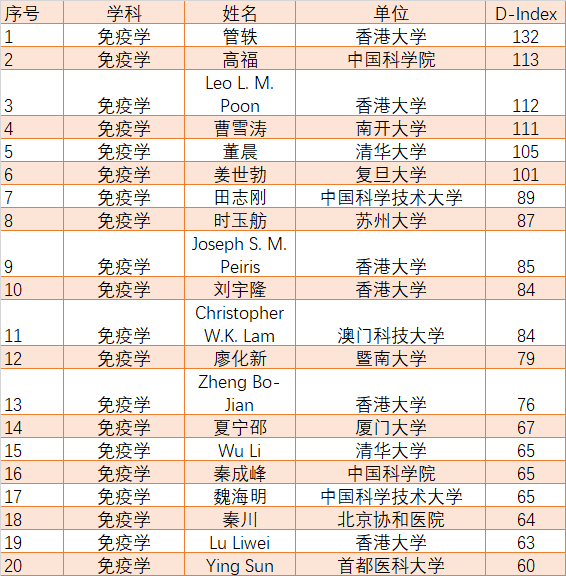 在免疫学领域,对多达8616名研究人员进行了分析,D指数阈值是40。