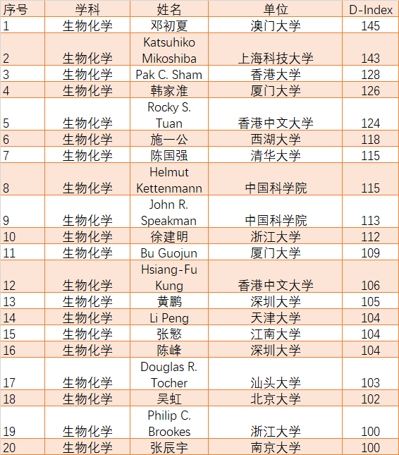 生物学和生物化学学科中,多达67599名研究人员进行了分析。D指数阈值为40。