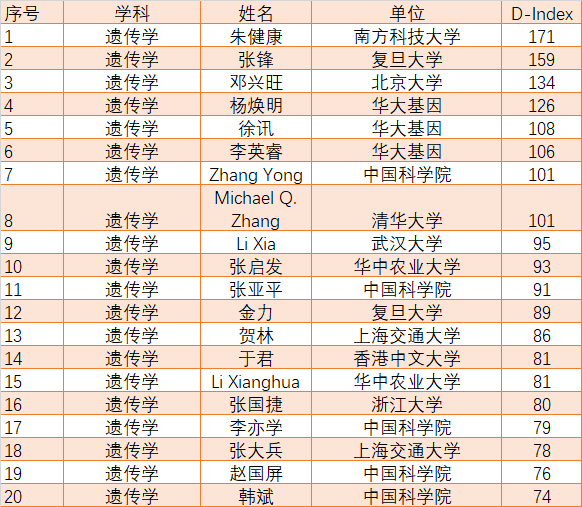 遗传学领域:朱健康、邓兴旺、杨焕明、张启发、金力、张国捷、张大兵、赵国屏、韩斌等人入选。