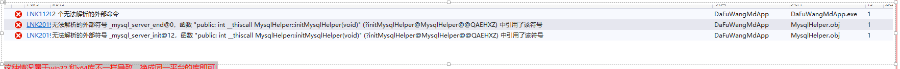 错误 LNK2019 无法解析的外部符号 mysqlserver_end@0,函数 "public: int __thiscall MysqlHelper::initMysqlHelper(void)" (?initMysqlHelper@MysqlHelper@@QAEHXZ) 中引用了该符号 DaFuWangMdApp C:\Users\brook\Desktop\md_future\MdSample\DaFuWangMdApp\MysqlHelper.obj 1