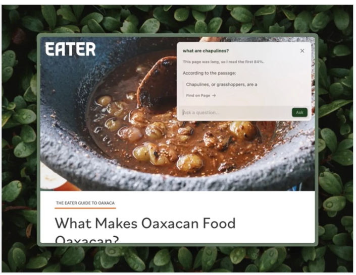 在接受 The Verge 采访时,The Browser Company 表示,它制作了各种原型,以使 AI 功能具有上下文性。团队尝试通过选择文本并将前进按钮转换为探索页面来实现自动记笔记。