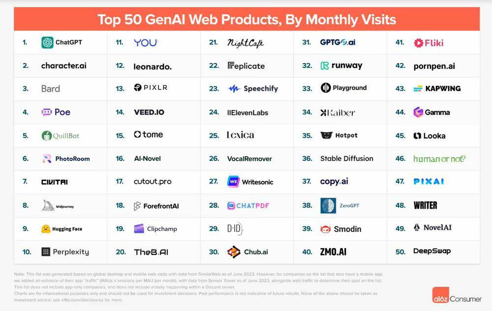 a16z 声称,此次排名主要参考的是 SimilarWeb 截至 2023 年 6 月的网站流量数据,对于有 App 的产品则是以估算(方法为 MAU 乘以每个用户平均月访问次数)流量数据,并进行了加权。
