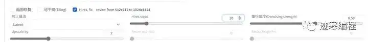 Highres. fix: 高清修复。默认情况下,文生图在高分辨率下会生成非常模糊的图像。如果使用高清修复,会型首先按照指定的尺寸生成一张图片,然后通过放大算法将图片分辨率扩大,以实现高清大图效果。最终尺寸为(原分辨率*缩放系数 Upscale by)。启用之后会多出来一些选项: