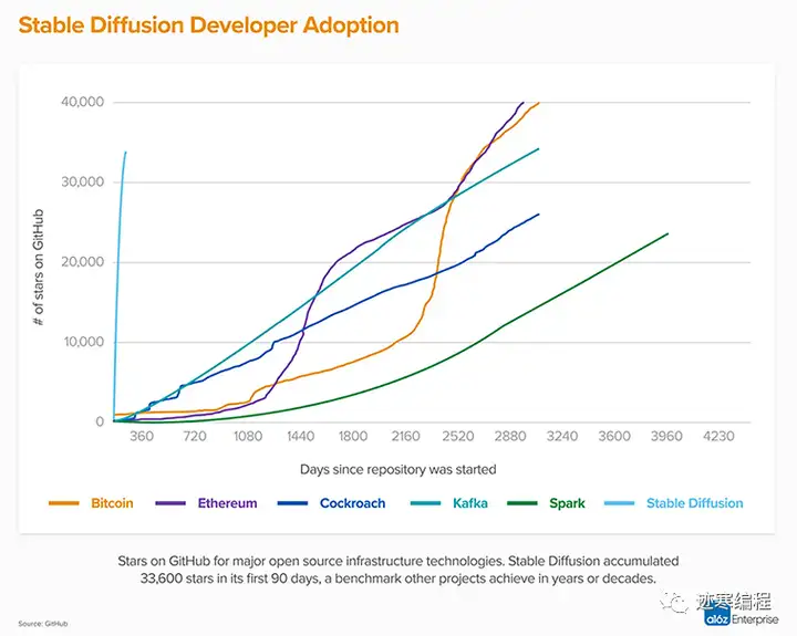 在短短三个月时间内,SD就在github收获了33K个star,其热门程度远超同期的Kafka、Spark、Bitcoin等知名项目,如下图所示。