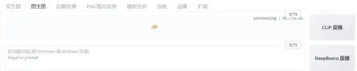 图生图的界面和文生图的界面类似,都有“提示词”、“反提示词”输入框,并且图生图多了两个按钮: