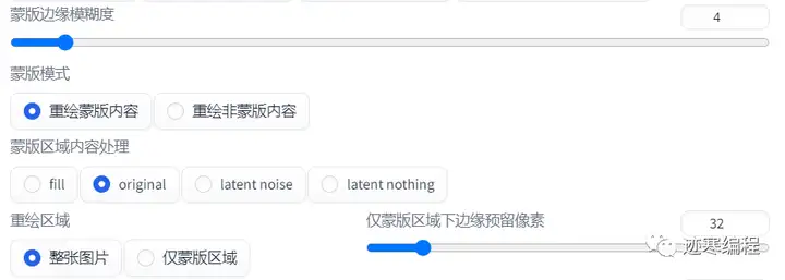 蒙版区域内容处理:fill就是全充满,original填充和原来一样的内容,latent noise 是潜空间噪声,latent nothing是什么都没有。一般选original就可以了。
