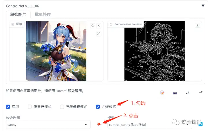 允许预览:将预处理器的结果显示出来。这个选项非常有用,建议勾选: