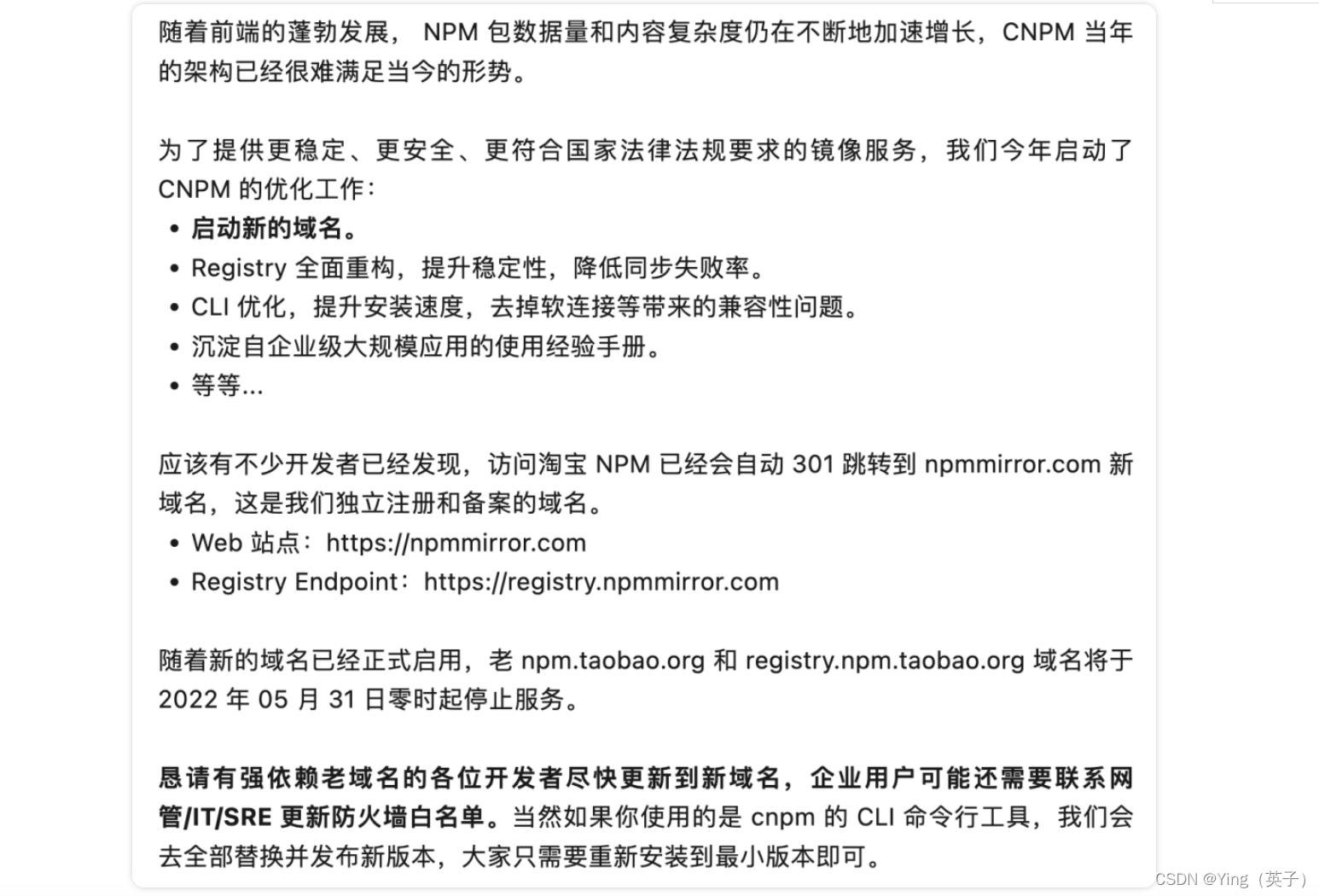 其实,早在 2021 年,淘宝就发文称,npm 淘宝镜像已经从 registry.npm.taobao.org 切换到了 registry.npmmirror.com。旧域名也将于 2022 年 5 月 31 日停止服务(不过,直到今天 HTTPS 证书到期才真正不能用了)