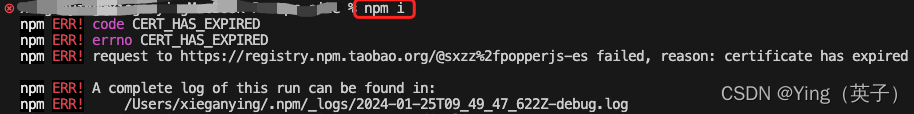 npm i 报错:request to https://registry.npm.taobao.org/@sxzz%2fpopperjs-es failed, reason: certificate has expired